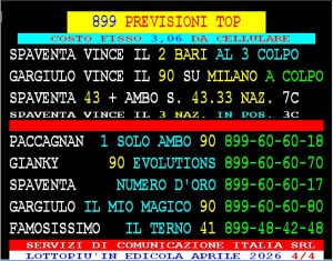 899 AGGIORNAMENTI: TONY M. all’899-03-03-86 ( costo 1 EURO compreso iva) PROPONE adesso ” SUPER QUATERNA VALIDA ANCHE Al 10elotto + Extra. Vincent ha centrato l’ambo secco 9.24 su Palermo e tutte con 275 vlp. Spaventa vince al 3* colpo ambo secco a tutte 74-44. Gargiulo vince al 1° colpo ambata 90 Cagliari e l’1 al 1° colpo ambata Milano..