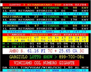 Lotto: iI 41 a BARI ritarda da 96 estrazione. LOTTOMIO n. 989 è in edicola ogni Martedì. Se non lo trovi LOTTOMIO e LOTTOPIU' chiama lo 0541 - 933782 oppure invia messaggino al nostro WhatsApp 335-8448925 ciao e grazie. Vinciamo su LOTTOMIO anche con Le SCOMMESSE con LA TRIPLA SECCA...