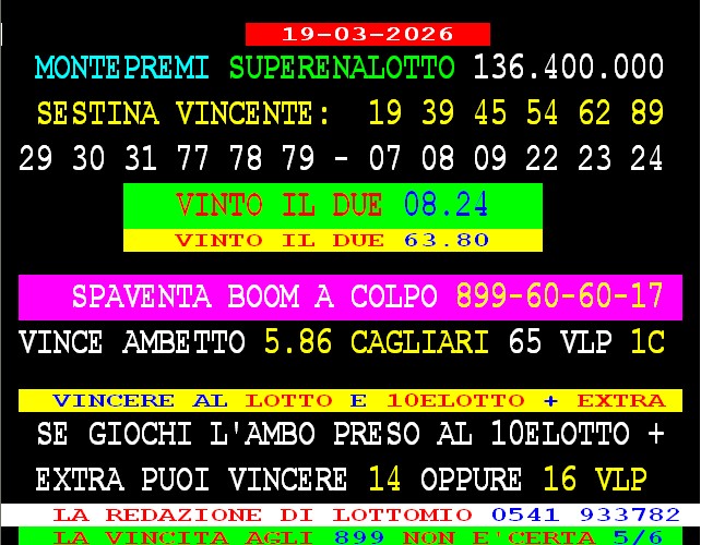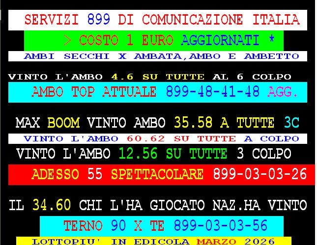 899 AGGIORNAMENTI: MAX DIAMANTE all’899-03-03-26 ( costo 1 EURO compreso iva) PROPONE adesso ” ADESSO 55 SPETTACOLARE ” 1 sola AMBO per tutti – servizio attivo 24 ore su 24 – MAX ha vinto l’ambo 35.58 su Tutte le ruote al 3 colpo. GIANKY vince al 3° colpo ambo in quartina 29 74 su Venezia. Spaventa vince al 1* colpo ambetto secco Cagliari 5-86 vinti 65vlp
