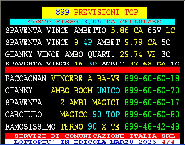 899 AGGIORNAMENTI: MAX DIAMANTE all’899-03-03-26 ( costo 1 EURO compreso iva) PROPONE adesso ” ADESSO 55 SPETTACOLARE ” 1 sola AMBO per tutti – servizio attivo 24 ore su 24 – MAX ha vinto l’ambo 35.58 su Tutte le ruote al 3 colpo. SPAVENTA Esiti al 5 colpo ambata 9 su CAGLIARI in 4* POS più ambetto secco 9-79. Vinti 60+ 55 vlp. GARGIULO vince ambata 57 Cagliari al 3 colpo. GIANKY vince al 3° colpo ambo in quartina 29 74 su Venezia.