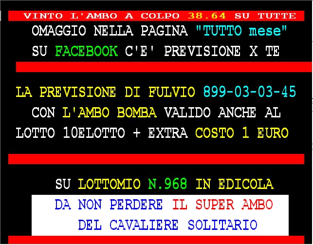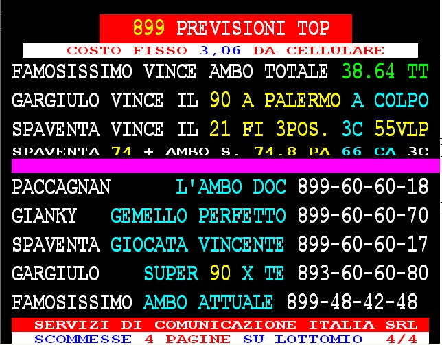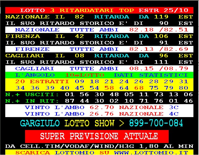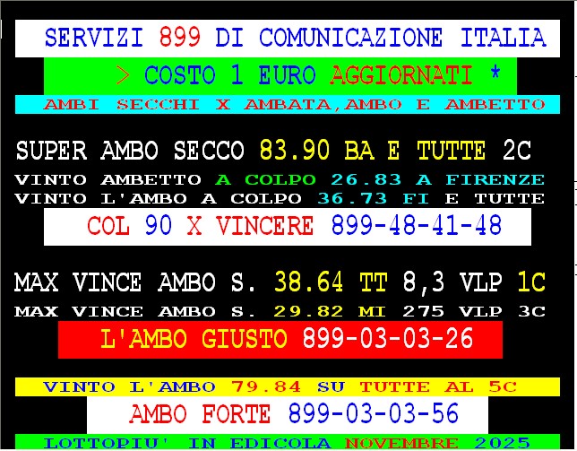 899 AGGIORNAMENTI: FAMOSISSIMO all’899-48-42-48 ( costo 3,66 compreso iva) PROPONE adesso ” AMBO ATTUALE ” attivo 24 ore su 24 giorno e notte. FAMOSISSIMO ha vinto l’ambo 38.64 su TUTTE a colpo !!! GARGIULO vince “90 d’oro” al 1° colpo ambata 90 Palermo. SPAVENTA vince al 1* colpo ambata 21 Firenze in 3* pos . con 55 vlp.