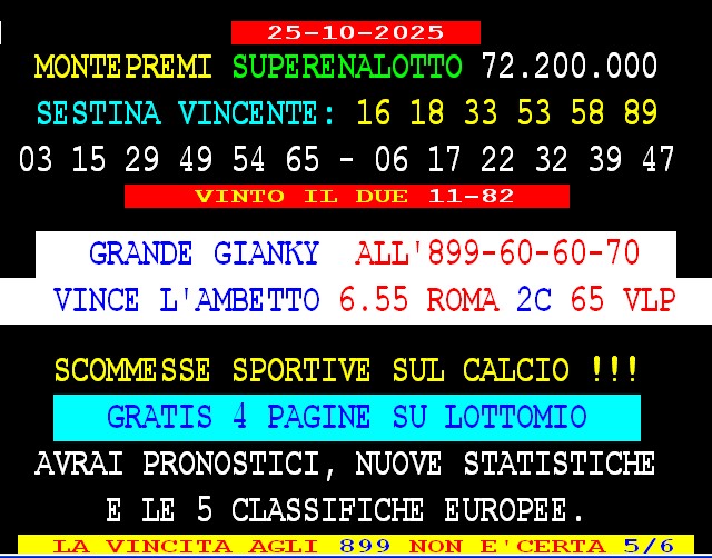 899 AGGIORNAMENTI: TONY MAGICO all’899-03-03-86 ( costo 1 EURO compreso iva) PROPONE adesso ” AMBO SUPER ” attivo 24 ore su 24 giorno e notte. Gargiulo vince “90 d’oro” ambo 13-57 Roma al 2° colpo / ambata 90 Genova al 3° colpo. Gargiulo vince “Lottoshow” al 3° colpo ambetto 62-70 Nazionale . Spaventa vince Al 5* colpo AMBATA 72 napoli. In 2* POS . Al 2* colpo ambata 70 su Naz. Al 5* colpo ambetto secco 27-77 su Venezia. Paccagnan vince l’ambo 75 59 Torino 250 vlp.