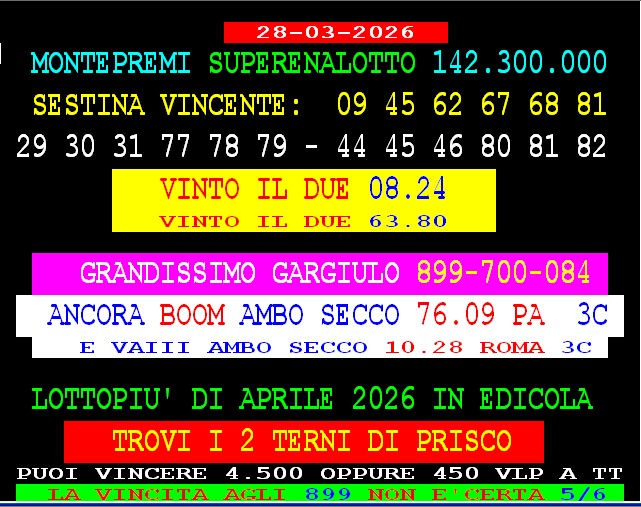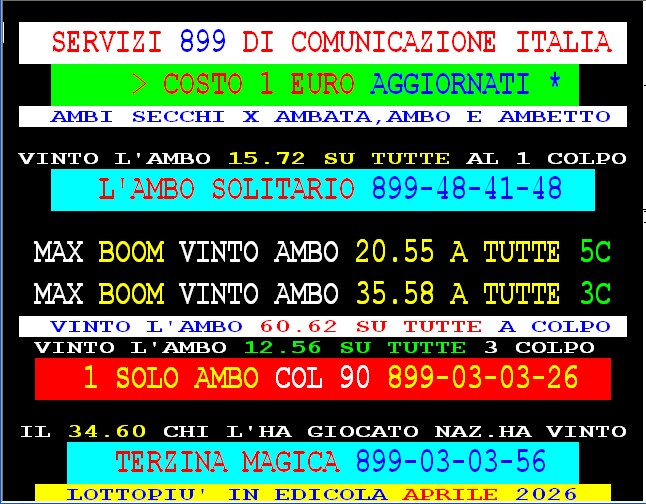899 AGGIORNAMENTI: MAX DIAMANTE all’899-03-03-26 ( costo 1 EURO compreso iva) PROPONE adesso ” ADESSO 55 SPETTACOLARE ” 1 sola AMBO per tutti – servizio attivo 24 ore su 24 – MAX ha vinto l’ambo 35.58 su Tutte le ruote al 3 colpo. GIANKY vince al 3° colpo ambo in quartina 29 74 su Venezia. Spaventa vince al 1* colpo ambetto secco Cagliari 5-86 vinti 65vlp