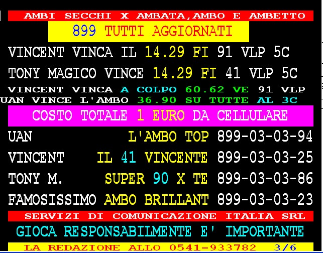 899 AGGIORNAMENTI: VINCENT all'899-03-03-25 ( costo 1 EURO compreso iva) PROPONE adesso " IL 41 VINCENTE " 1 sola AMBO per tutti - servizio attivo 24 ore su 24 - VINCENT ha vinto l'ambo 14.29 su Firenza con 91 vlp 5 colpo. Tony magico vince anche lui il 14.29 su Firenze con 41 vlp 5 colpo. Gargiulo vince il 90 su Napoli.