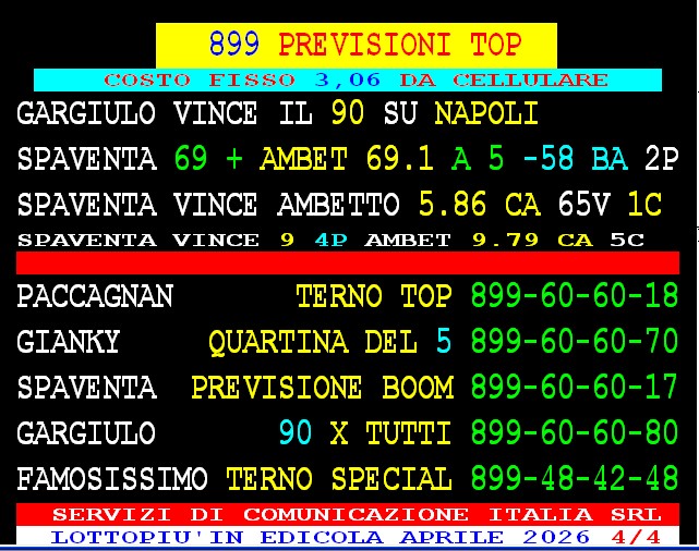 899 AGGIORNAMENTI: TONY MAGICO all’899-03-03-86 ( costo 1 EURO compreso iva) PROPONE adesso ” AMBO UNICO 55 ” 1 sola AMBO per tutti – servizio attivo 24 ore su 24 – SPAVENTA vince il 31 sulla Nazionale in 1 posizione con 55 vlp 3 colpo. Vinto l’ambo 4.6 su Tutte le ruote con Demetrio.