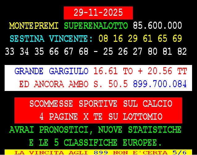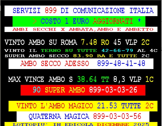 899 AGGIORNAMENTI: MAX DIAMANTE all’899-03-03-26 ( costo 1 EURO compreso iva) PROPONE adesso ” AMBO ATTUALE X TE ” attivo 24 ore su 24 giorno e notte. PACCAGNAN vince vince l’ambata 77 Torino – GARGIULO vince con Lottoshow al 1° colpo ambata 71 Palermo 90 d’oro: al 1° colpo 90 Torino e ambetto 90-10 – SPAVENTA vince al 2* colpo ambo secco a Bari 43-77 con 275 vlp.