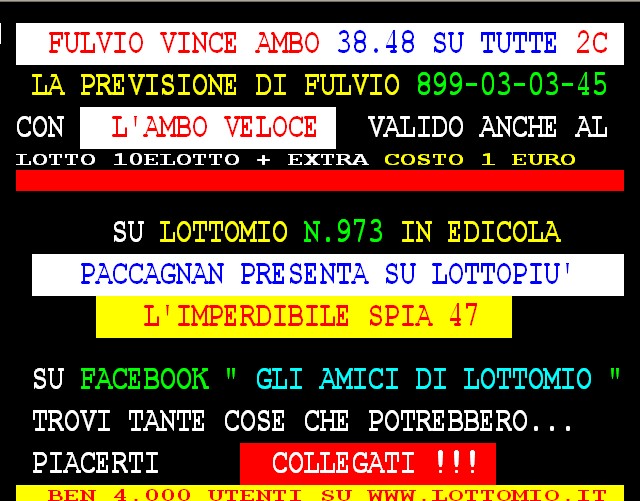 899 AGGIORNAMENTI: FULVIO all’899-03-03-45 ( costo 1 EURO compreso iva) PROPONE adesso ” L’AMBO VELOCE ” attivo 24 ore su 24 giorno e notte. FULVIO vince l’ambo 38.48 su TUTTE con 25 vlp. Famosissimo vince al 2 colpo l’ambo forte su TUTTE 43.68 e al 5 colpo l’ambo 19.24 sempre su tutte.