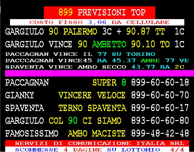 899 AGGIORNAMENTI: TONY MAGICO all'899-03-03-86 ( costo 1 EURO compreso iva) PROPONE adesso " 90 AMBO UNICO" attivo 24 ore su 24 giorno e notte. GARGIULO vince: 90 d'oro al 1° colpo ambo secco 90-.87 a tutte ; ambata 90 Palermo al 3° colpo lottoshow al 2° colpo ambo a tutte 12-61 -