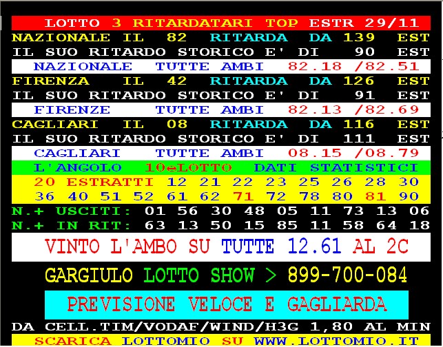 899 AGGIORNAMENTI: FULVIO all’899-03-03-45 ( costo 1 EURO compreso iva) PROPONE adesso ” L’AMBO VELOCE ” attivo 24 ore su 24 giorno e notte. FULVIO vince l’ambo 38.48 su TUTTE con 25 vlp. Famosissimo vince al 2 colpo l’ambo forte su TUTTE 43.68 e al 5 colpo l’ambo 19.24 sempre su tutte. Gianky vince ambetto 71.88 su Venezia al 2 colpo. Paccagnan vince l’ambata 90 a Cagliari 4 colpo. Gargiulo vince ambata 90 Cagliari al 3° colpo.