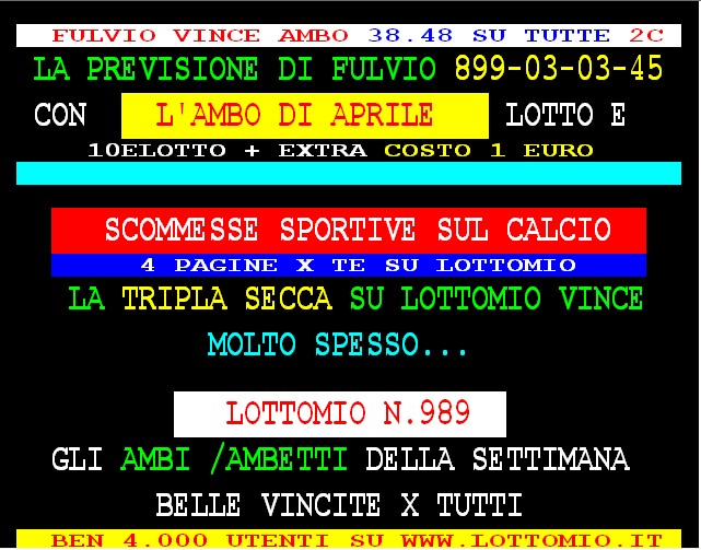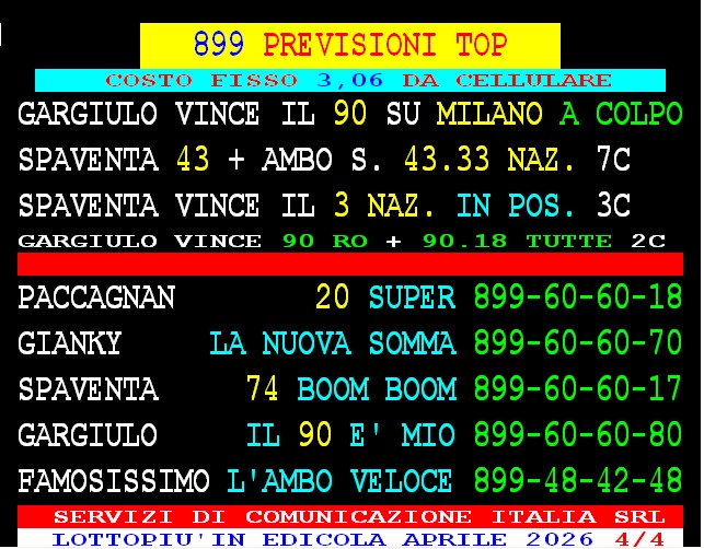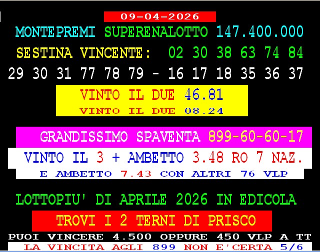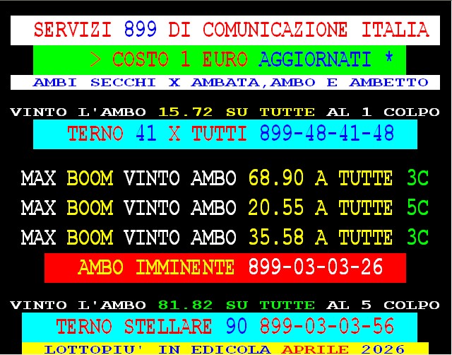 899 AGGIORNAMENTI: VINCENT all’899-03-03-25 ( costo 1 EURO compreso iva) PROPONE adesso ” IL 41 VINCENTE ” 1 sola AMBO per tutti – servizio attivo 24 ore su 24 – VINCENT ha vinto l’ambo 14.29 su Firenze con 91 vlp 5 colpo. Tony magico vince anche lui il 14.29 su Firenze con 41 vlp 5 colpo. AGGIORNAMENTI: VINCENT all’899-03-03-25 ( costo 1 EURO compreso iva) NUOVE VINCITE DI Gargiulo col “90 d’ oro” ambata 90 Roma al 2 colpo, e ambo a TUTTE 90.18 al 3 colpo.