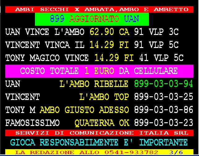 899 AGGIORNAMENTI: VINCENT all’899-03-03-56 ( costo 1 EURO compreso iva) PROPONE adesso ” TERNO STELLARE COL 90. Spaventa vince Al 4 colpo ambata 3 Ro e ambetto secco 3-48. Al 2* colpo ambata 7 su Naz più ambetto secco 7-43 per complessivi 152 euro.