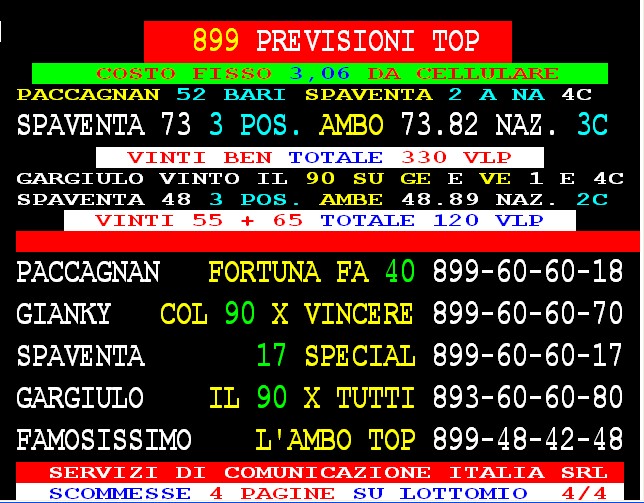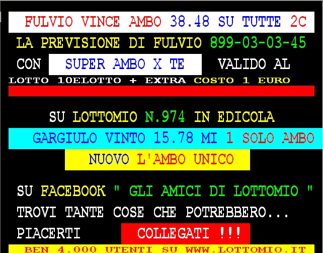 899 AGGIORNAMENTI: UAN all'899-03-03-94 ( costo 1 EURO compreso iva) PROPONE adesso " 90 AMBO X TUTTI " attivo 24 ore su 24 giorno e notte. TONY MAGICO vince l'ambo 11.75 a Venezia con 95 vlp al 4 colpo. Max Diamante vince l'ambo secco 11.75 su Venezia e Tutte con 275 vlp al 4 colpo. La Redazione vince l'ambo secco 62.90 a Roma e Tutte con 275 vlp al 4 colpo. Gargiulo vince l'ambata 16 a Napoli a colpo. Spaventa vince il 2 a Napoli 4c.