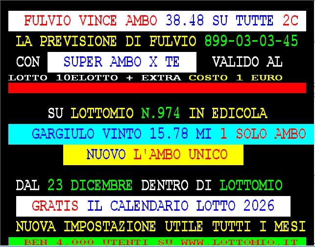 899 AGGIORNAMENTI: MAX DIAMANTE all’899-03-03-26 ( costo 1 EURO compreso iva) PROPONE adesso ” AMBO ATTUALE X TE ” attivo 24 ore su 24 giorno e notte. PACCAGNAN vince vince l’ambata 77 Torino – GARGIULO vince con Lottoshow al 1° colpo ambata 71 Palermo 90 d’oro: al 1° colpo 90 Torino e ambetto 90-10 – SPAVENTA vince al 2* colpo ambo secco a Bari 43-77 con 275 vlp.