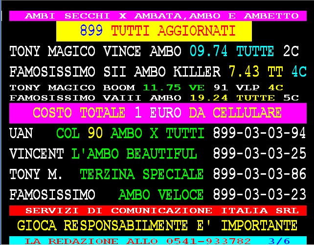 899 AGGIORNAMENTI: UAN all’899-03-03-94 ( costo 1 EURO compreso iva) PROPONE adesso ” 90 AMBO X TUTTI ” attivo 24 ore su 24 giorno e notte. TONY MAGICO vince l’ambo 11.75 a Venezia con 95 vlp al 4 colpo. Max Diamante vince l’ambo secco 11.75 su Venezia e Tutte con 275 vlp al 4 colpo. La Redazione vince l’ambo secco 62.90 a Roma e Tutte con 275 vlp al 4 colpo. Gargiulo vince l’ambata 90 ambata su 90 Genova al 2° colpo, ambata 90 Venezia al 1/4 colpo –