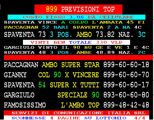899 AGGIORNAMENTI: UAN all’899-03-03-94 ( costo 1 EURO compreso iva) PROPONE adesso ” 90 AMBO X TUTTI ” attivo 24 ore su 24 giorno e notte. TONY MAGICO vince l’ambo 9.74 su tutte al 2 colpo. GARGIULO vince con Lottoshow ambata 61 Cagliari al 3° colpo / ambata 90 Napoli al 3° colpo. Spaventa vince a colpo il 45 su Firenze.