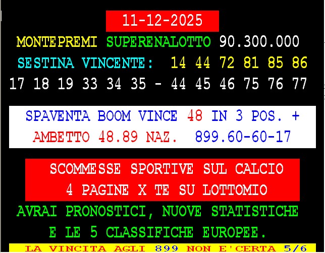 899 AGGIORNAMENTI: MAX DIAMANTE all’899-03-03-26 ( costo 1 EURO compreso iva) PROPONE adesso ” AMBO ATTUALE X TE ” attivo 24 ore su 24 giorno e notte. PACCAGNAN vince BA 45 ambata e 45 37 ambetto a 2 colpo poi a colpo VE 77 ambata – GARGIULO vince con Lottoshow al 1° colpo ambetto 16-61 Torino, al 2° colpo ambo secco a tt 20-56, al 3° colpo ambo secco 50-5 a Venezia – SPAVENTA vince al 2* colpo ambo secco a Bari 43-77 con 275 vlp.