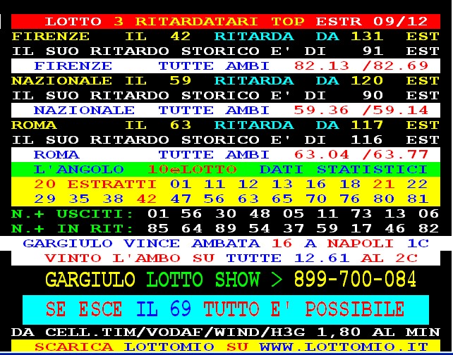 899 AGGIORNAMENTI: TONY MAGICO all’899-03-03-86 ( costo 1 EURO compreso iva) PROPONE adesso ” 90 AMBO UNICO” attivo 24 ore su 24 giorno e notte. GARGIULO vince: 90 d’oro al 1° colpo ambo secco 90-.87 a tutte ; ambata 90 Palermo al 3° colpo lottoshow al 2° colpo ambo a tutte 12-61 – Spaventa vince Al 2* colpo ambata 48 in 3* POS su Naz più ambetto secco 48-89. Vinti 65+ 55 vlp. TOTALE 120 VLP.
