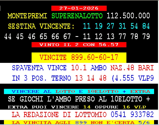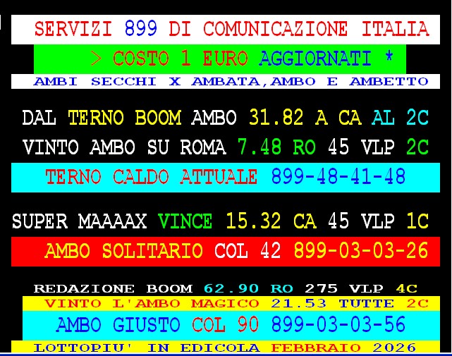 899 AGGIORNAMENTI: UAN all’899-03-03-94 ( costo 1 EURO compreso iva) PROPONE adesso ” AMBO D’ORO DEL 2026 ” attivo 24 ore su 24 – Gargiulo vince con Lottoshow ambetto 1-37 Bari con 65 vlp. Paccagnan Vince 4 VE AL 5’ colpo. Spaventa vince a 1* colpo ambata 38 Naz. Gargiulo vince con Lottoshow al 1° colpo ambo secco 3-21 su Tutte.