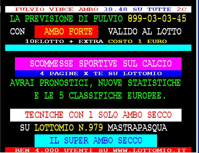 899 AGGIORNAMENTI: UAN all’899-03-03-94 ( costo 1 EURO compreso iva) PROPONE adesso ” AMBO BRILLANTE COL 90 ” attivo 24 ore su 24 – Gargiulo vince con Lottoshow vince a colpo il 42 su Torino.