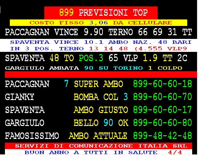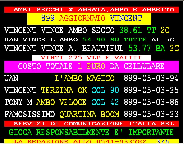 899 AGGIORNAMENTI: FAMOSISSIMO all’899-03-03-23 ( costo 1 EURO compreso iva) PROPONE adesso ” QUATERNA BOOM ” attivo 24 ore su 24 – Spaventa 3* colpo ambata 10 su Naz in 5* pos più Ambo secco con oro 10-1 più ambetto secco 10-68. Al 5* colpo ambata 48 su Bari in 3* POS + ambi secchi e terno secco 13-14-48 . Vinti 4500 vlp + 55 vlp . Paccagnan ambo secco 9 90 ambo a tutte al 3’ colpo stasera 4 a Venezia ambata più TERNO secco A TUTTE a colpo 66 69 31 con 450 vlp.