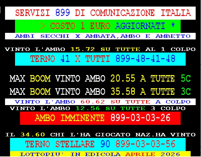 899 AGGIORNAMENTI: VINCENT all’899-03-03-25 ( costo 1 EURO compreso iva) PROPONE adesso ” IL 41 VINCENTE ” 1 sola AMBO per tutti – servizio attivo 24 ore su 24 – VINCENT ha vinto l’ambo 14.29 su Firenza con 91 vlp 5 colpo. Tony magico vince anche lui il 14.29 su Firenze con 41 vlp 5 colpo. Gargiulo vince 2 ambi secchi con Lottoshow ambo secco 61.16 Firenze al 7 colpo, ambo secco 25.65 Cagliari al 3 colpo.