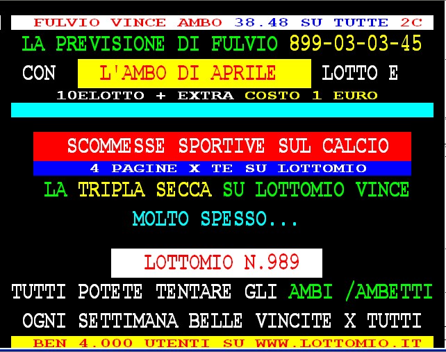 899 AGGIORNAMENTI: VINCENT all’899-03-03-25 ( costo 1 EURO compreso iva) PROPONE adesso ” IL 41 VINCENTE ” 1 sola AMBO per tutti – servizio attivo 24 ore su 24 – VINCENT ha vinto l’ambo 14.29 su Firenze con 91 vlp 5 colpo. Tony magico vince anche lui il 14.29 su Firenze con 41 vlp 5 colpo. AGGIORNAMENTI: VINCENT all’899-03-03-25 ( costo 1 EURO compreso iva) NUOVE VINCITE DI Gargiulo col “90 d’ oro” ambata 90 Roma al 2 colpo, e ambo a TUTTE 90.18 al 3 colpo.