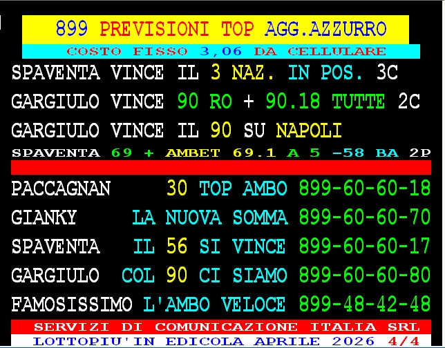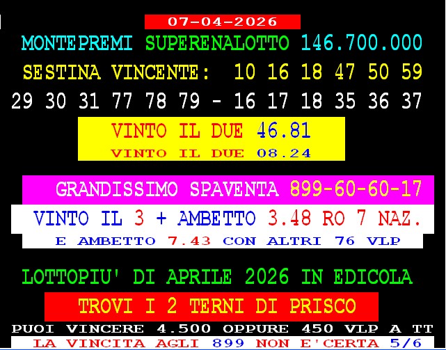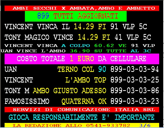 899 AGGIORNAMENTI: VINCENT all’899-03-03-56 ( costo 1 EURO compreso iva) PROPONE adesso ” TERNO STELLARE COL 90. Spaventa vince Al 4 colpo ambata 3 Ro e ambetto secco 3-48. Al 2* colpo ambata 7 su Naz più ambetto secco 7-43 per complessivi 152 euro.