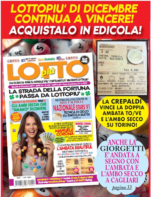 LOTTOPIU' DI DICEMBRE IN EDICOLA - 1 SOLO ACQUISTO MENSILE E TI TIENE ANCHE TANTA COMPAGNIA...da non perdere la tecnica di Paccagnan "L'IMPERDIBILE SPIA 47" per vincere l'ambo secco.