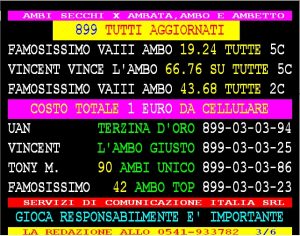 899 AGGIORNAMENTI: FULVIO all’899-03-03-45 ( costo 1 EURO compreso iva) PROPONE adesso ” L’AMBO VELOCE ” attivo 24 ore su 24 giorno e notte. FULVIO vince l’ambo 38.48 su TUTTE con 25 vlp. Famosissimo vince al 2 colpo l’ambo forte su TUTTE 43.68 e al 5 colpo l’ambo 19.24 sempre su tutte. Gianky vince ambetto 71.88 su Venezia al 2 colpo. Paccagnan vince l’ambata 90 a Cagliari 4 colpo. Gargiulo vince ambata 90 Cagliari al 3° colpo.