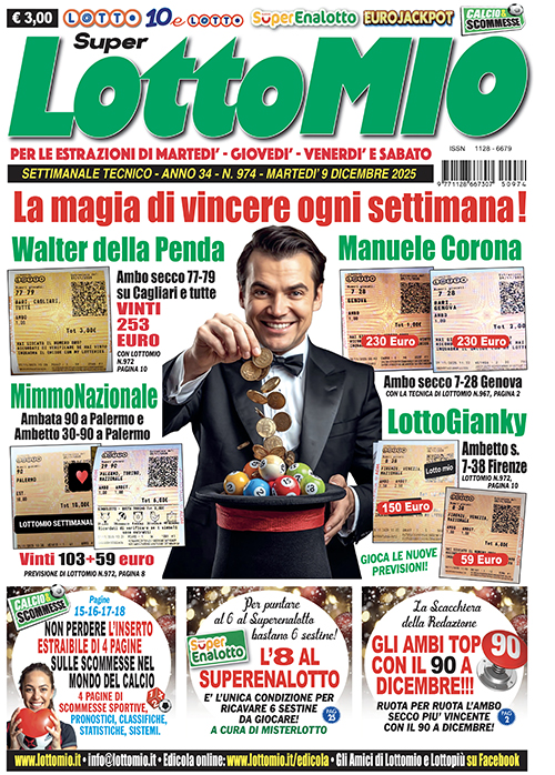 Se lo vuoi subito al Lunedì basta scaricarlo su “www.lottomio.it/edicola” 32 pagine a colori comprese 4 pagine di scommesse sportive sul calcio. Acquistalo in edicola. LOTTOMIO N. 974 ? LO PUOI GIA’ SCARICARE ONLINE su “www.lottomio.it/edicola” #lotto #edicola #superenalotto #lottomio #vincere #terno #10elotto #eurojackpot #scommesse #calcioscommesse #scommessevincenti….