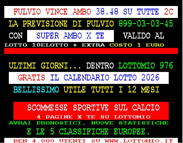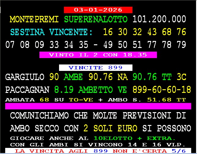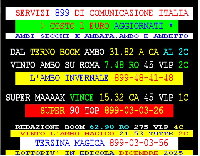 899 AGGIORNAMENTI: MAX DIAMNTE all’899-03-03-26 ( costo 1 EURO compreso iva) PROPONE adesso ” SUPER QUATERNA COL 90 ” attivo 24 ore su 24 giorno e notte. GARGIULO vince con “Lottoshow” al 5° colpo ambo secco 40-85 Roma. PACCAGNAN vince Vincita a colpo VE 40 più ambo tutte 40 85 Poi doppia ambata 68 a TO VE PIÙ AMBO SECCO A TUTTE 68 51 . SPAVENTA vince Esiti al 7* colpo ambo secco 81-73 su Bari.