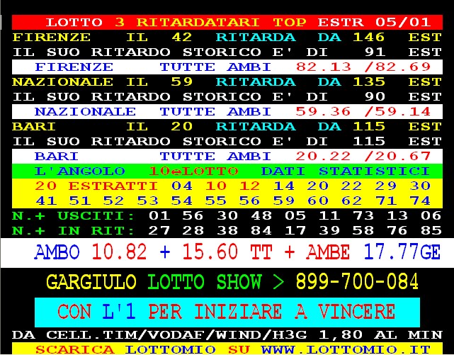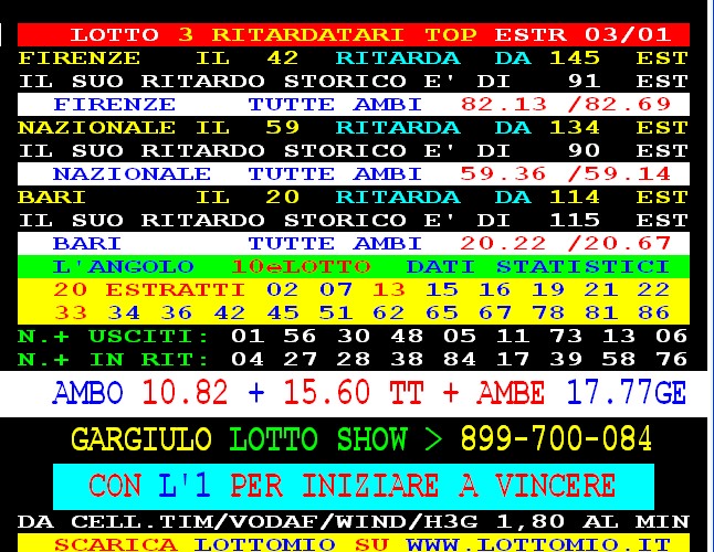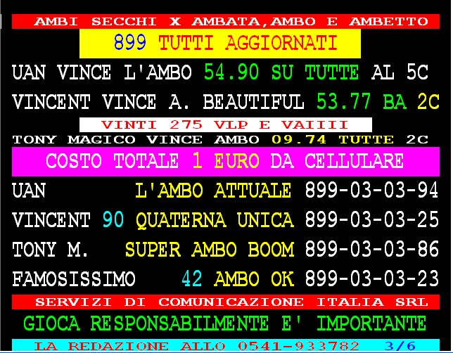 899 AGGIORNAMENTI: MAX DIAMANTE all’899-03-03-26 ( costo 1 EURO compreso iva) PROPONE adesso ” L’AMBO VELOCISSIMO ” attivo 24 ore su 24 giorno e notte. Max Diamante vince a colpo l’ambo 15.32 a Cagliari e tutte con 45 vlp. Super GARGIULO vince ancora con “Lottoshow” ambo secco 15.60 su TUTTE. PACCAGNAN SPETTACOLARE !!! Vince a colpo l’ambata 8 e l’ambetto 8.19 a VE 40. VINCENT codice da 1 euro (899.03.03.25) vince l’ambo secco 53.77 a Bari e tutte con 275 vlp.