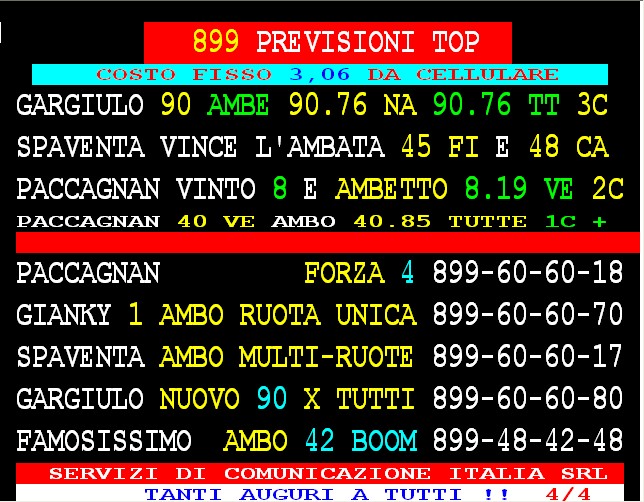 899 AGGIORNAMENTI: LA REDAZIONE all’899-48-41-48 ( costo 1 EURO compreso iva) PROPONE adesso ” TERZINA DELLE FESTE ” attivo 24 ore su 24 giorno e notte. La redazione vince l’ambo 31.82 su Cagliari con 91 vlp al 2 colpo. Super GARGIULO vince con “90 d’ oro” ambata 90 Napoli al 3° colpo,e ambetto 90-76 / ambo a tt 90-76 al 3° colpo…Lottoshow ambo a tt 82-10 / ambetto genova 88-17 / ambo att 15-60