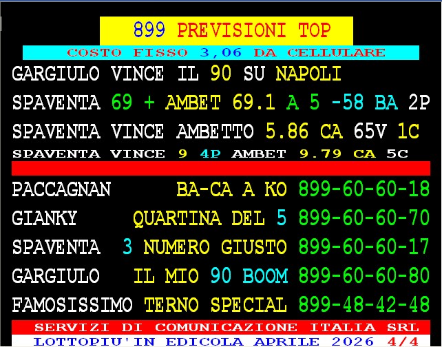 899 AGGIORNAMENTI: VINCENT all’899-03-03-25 ( costo 1 EURO compreso iva) PROPONE adesso ” IL 41 VINCENTE ” 1 sola AMBO per tutti – servizio attivo 24 ore su 24 – VINCENT ha vinto l’ambo 14.29 su Firenza con 91 vlp 5 colpo. Tony magico vince anche lui il 14.29 su Firenze con 41 vlp 5 colpo. Gargiulo vince 2 ambi secchi con Lottoshow ambo secco 61.16 Firenze al 7 colpo, ambo secco 25.65 Cagliari al 3 colpo.