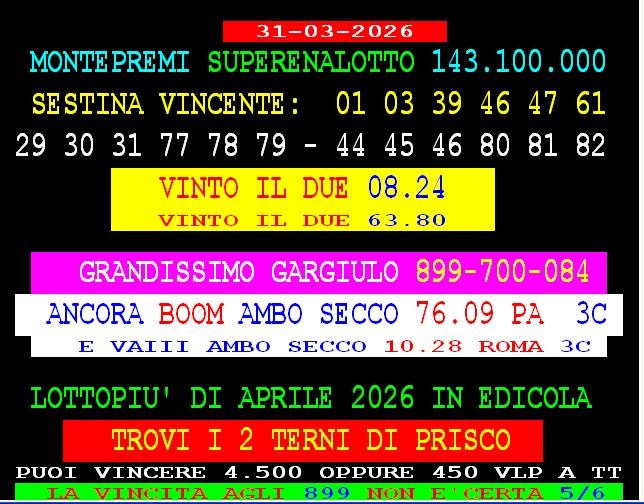 899 AGGIORNAMENTI: LA REDAZIONE all’899-03-03-56 ( costo 1 EURO compreso iva) PROPONE adesso ” AMBO FULMINE 81 ” 1 sola AMBO per tutti – servizio attivo 24 ore su 24 – Eccezionale Gargiulo Lottoshow al 3° colpo ambo secco 10-28 a Roma CON 275 VLP. STRAORDINARI GARGIULO vince ancora l’ambo secco con 76.9 a Palermo con Lottoshow al 3 colpo.