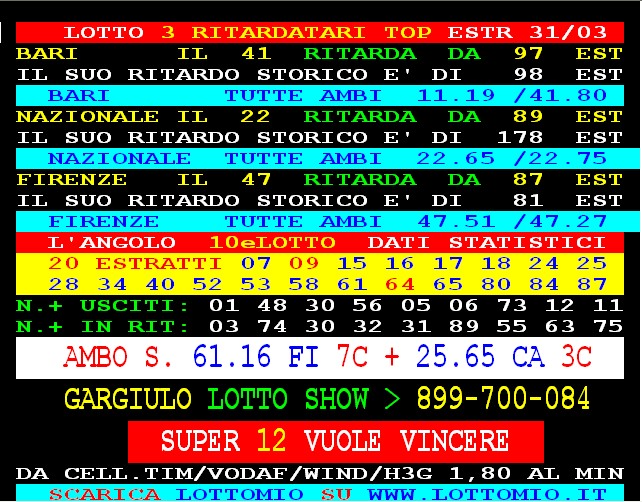 899 AGGIORNAMENTI: LA REDAZIONE all’899-03-03-56 ( costo 1 EURO compreso iva) PROPONE adesso ” AMBO FULMINE 81 ” 1 sola AMBO per tutti – servizio attivo 24 ore su 24 – Eccezionale Gargiulo Lottoshow al 3° colpo ambo secco 10-28 a Roma CON 275 VLP. STRAORDINARI GARGIULO vince ancora l’ambo secco con 76.9 a Palermo con Lottoshow al 3 colpo.